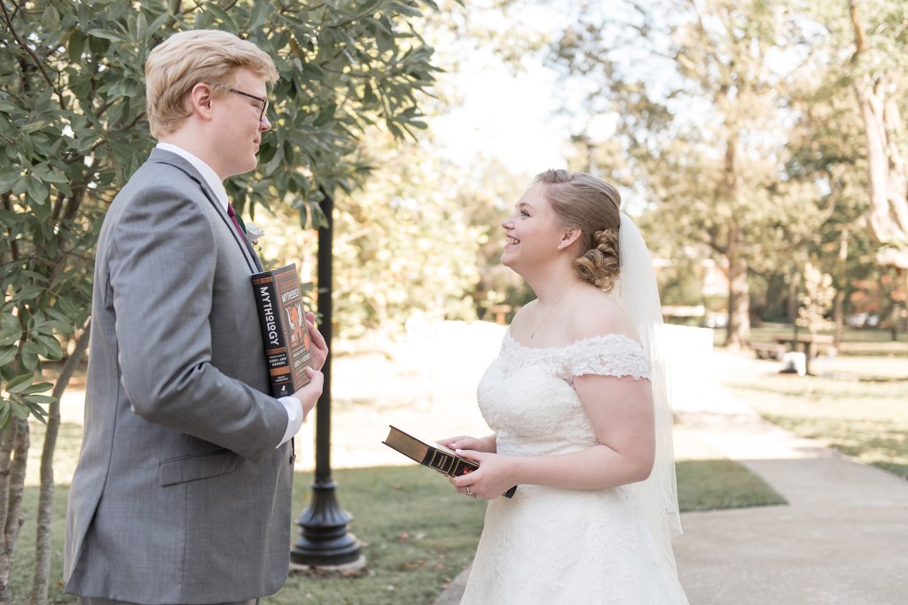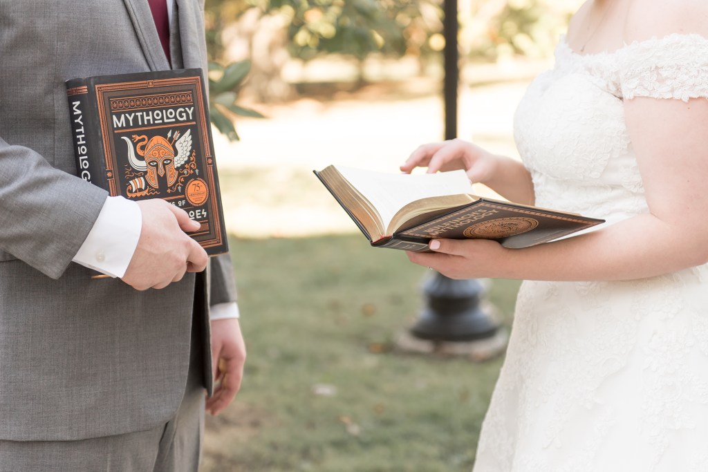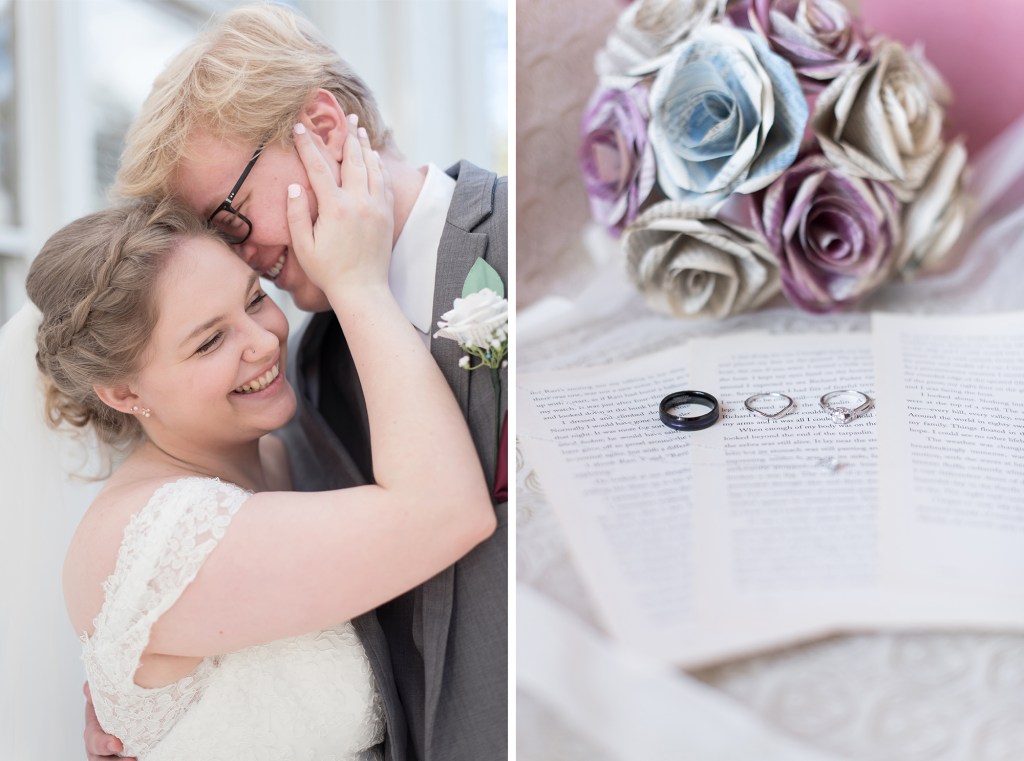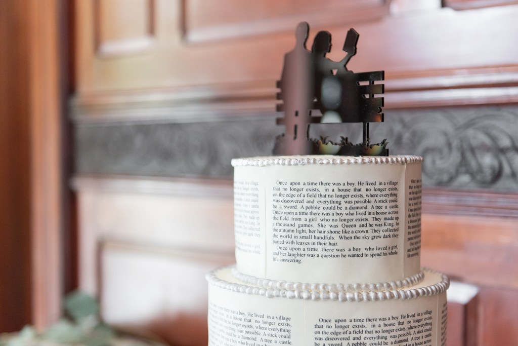 It wasn’t ALL jokes, there were some very sweet and emotional moments throughout the day. The ceremony was rather emotional, with the handfasting ceremony and hand-written vows. I loved all the personal touches they incorporated, folding favorite books into the paper bouquets and boutonnieres, hers a novel and his a math textbook (true story). Finally, the cake, the pièce de résistance of the reception, was decorated with “book pages” with a passage from The History of Love …